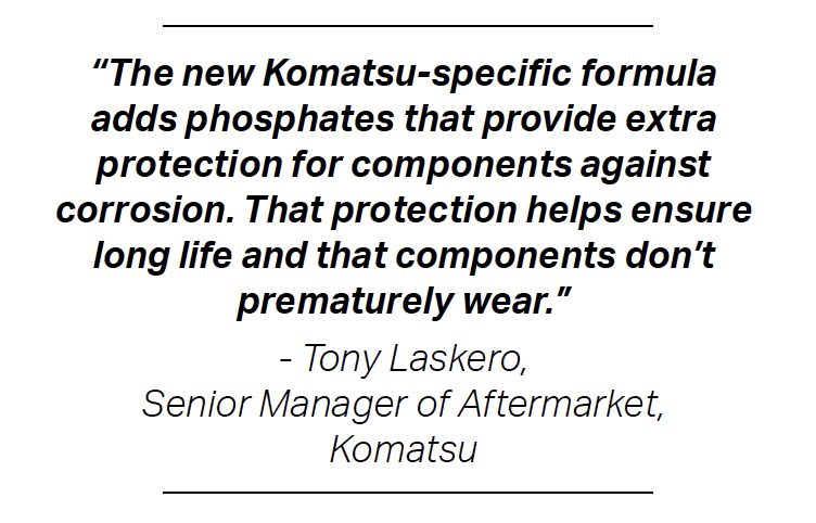 “The new Komatsu-specific formula adds phosphates that provide extra protection for components against corrosion,” explained Tony Laskero, Komatsu’s Senior Manager of Aftermarket. “That protection helps ensure long life and that components don’t prematurely wear.”